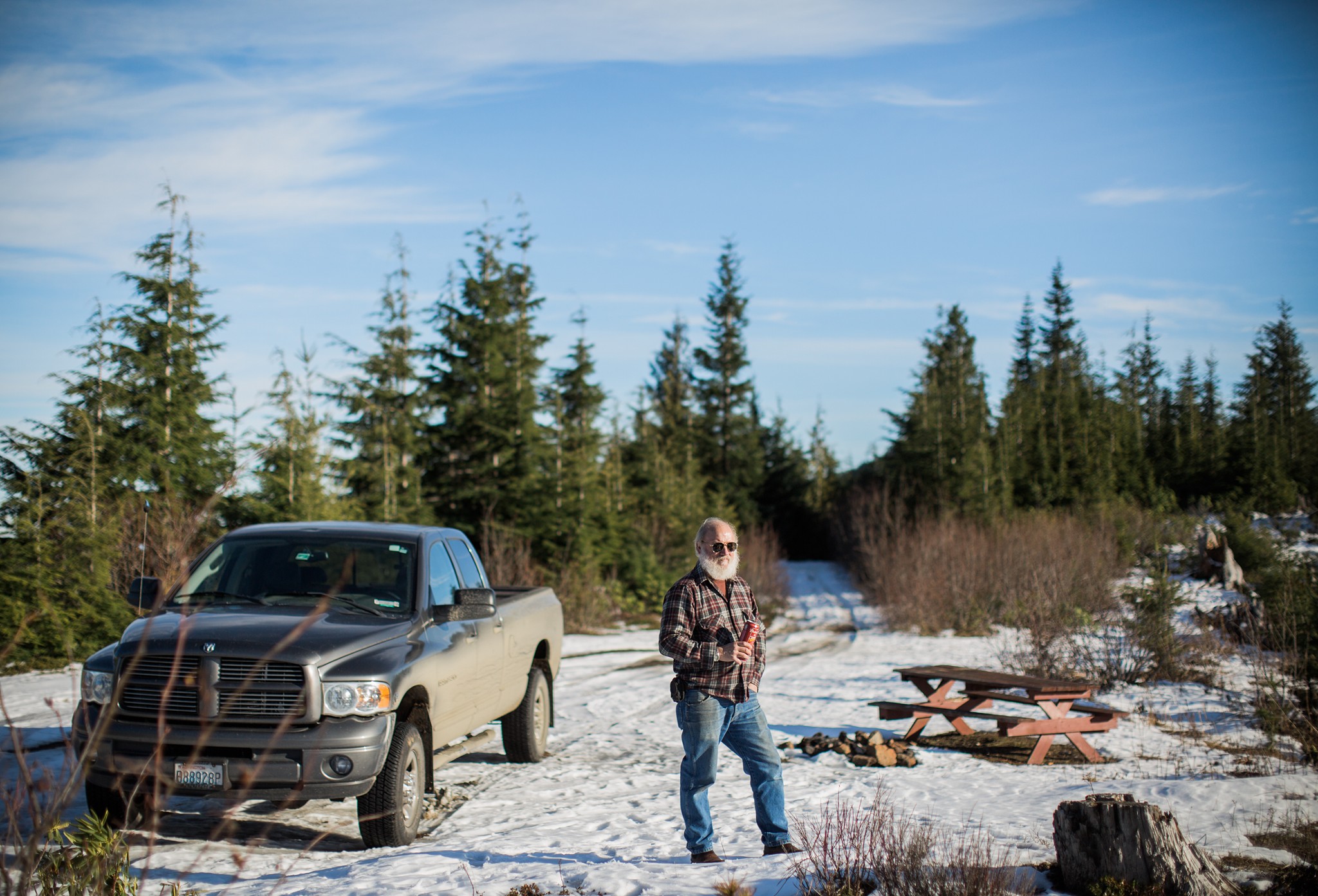 She and her dad hop into the truck early one morning, travel mugs full of coffee hot from the Keurig, and set out towards the Olympics in search of snow. Forgetting all about packing a lunch, they drive until they find the old logging roads he used to travel during hunting seasons past. The truck takes them as high as the road will go, where they find a red picnic table and far-away views of Mt. Rainier.